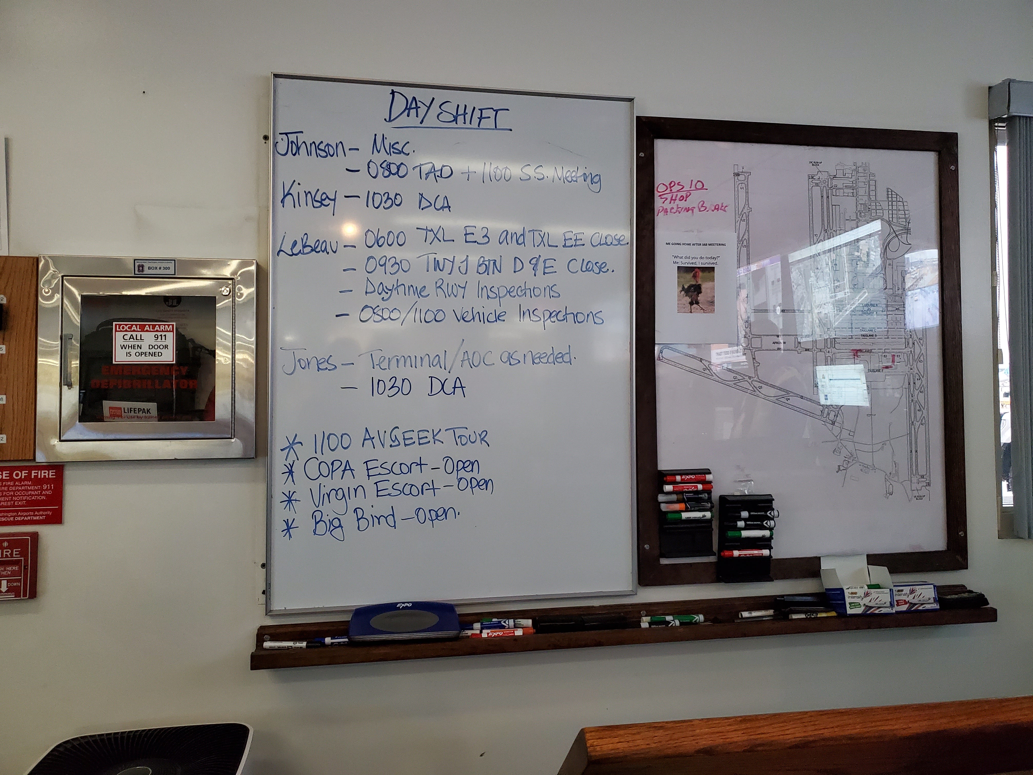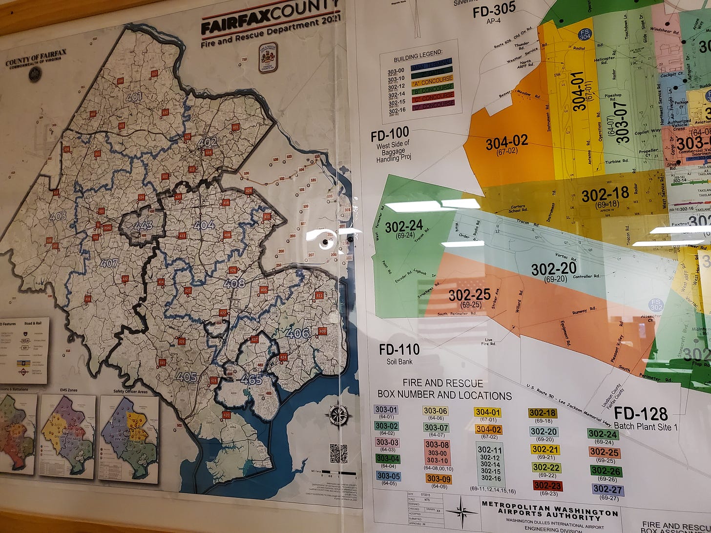 There’s nothing grand about most of the facilities here, especially the non-public-facing ones. The fire department building is practical and workaday. Badges and keys are out for clocking-in employees to grab (anyone could have snagged one as a souvenir). Giant maps of the airport and surrounding areas adorn the halls. The break room is a few chairs and a coffee pot. There was a little barbecue grill/smoker combo in the middle of the fire engine garage. It almost felt like being invited into someone’s home.