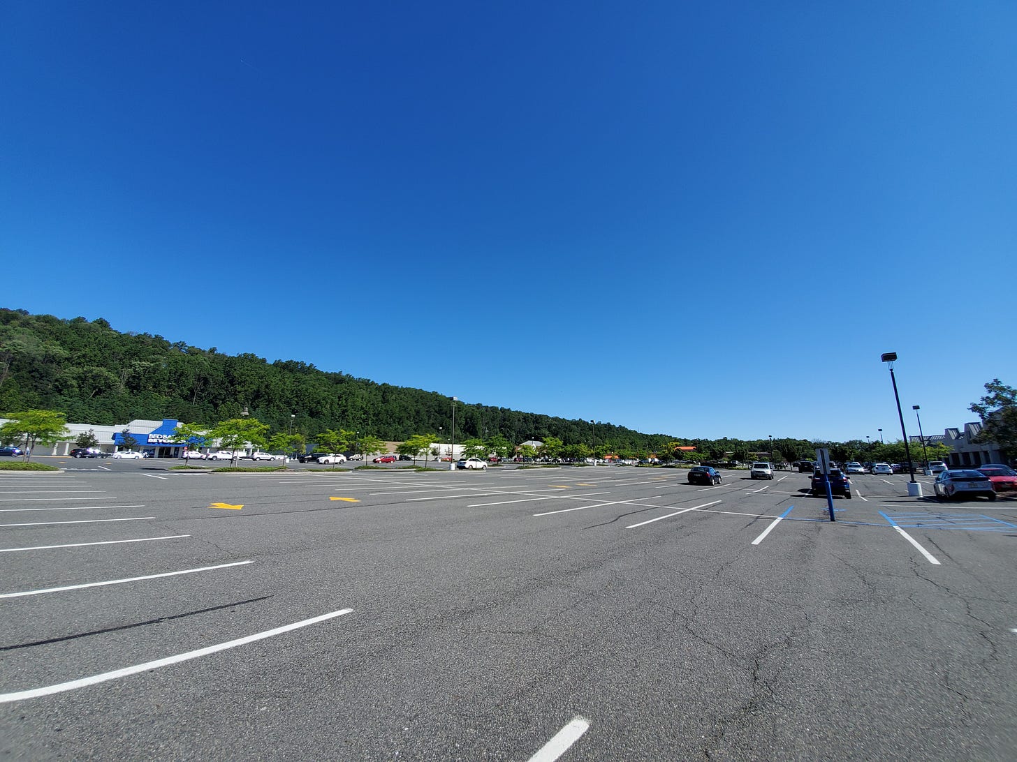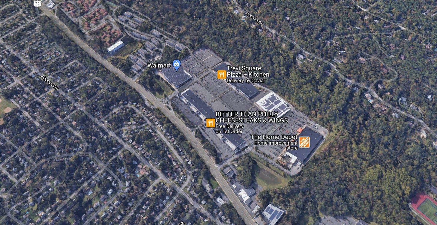 Route 22 is also home to this massive double-decker “power center” strip plaza, in Watchung. It boasts a bunch of small stores plus a whole bunch of big-boxes—both a Walmart and a Target. There’s a big retaining wall behind it, because it’s basically carved out of a slope. You have to drive up an inclined road to get to the larger second story. Shopping here, you certainly notice how big the parking lot is, but it doesn’t really register until you see it like this. The scale of this—and the scale of the various inputs and outputs that keep it going—are just massive.