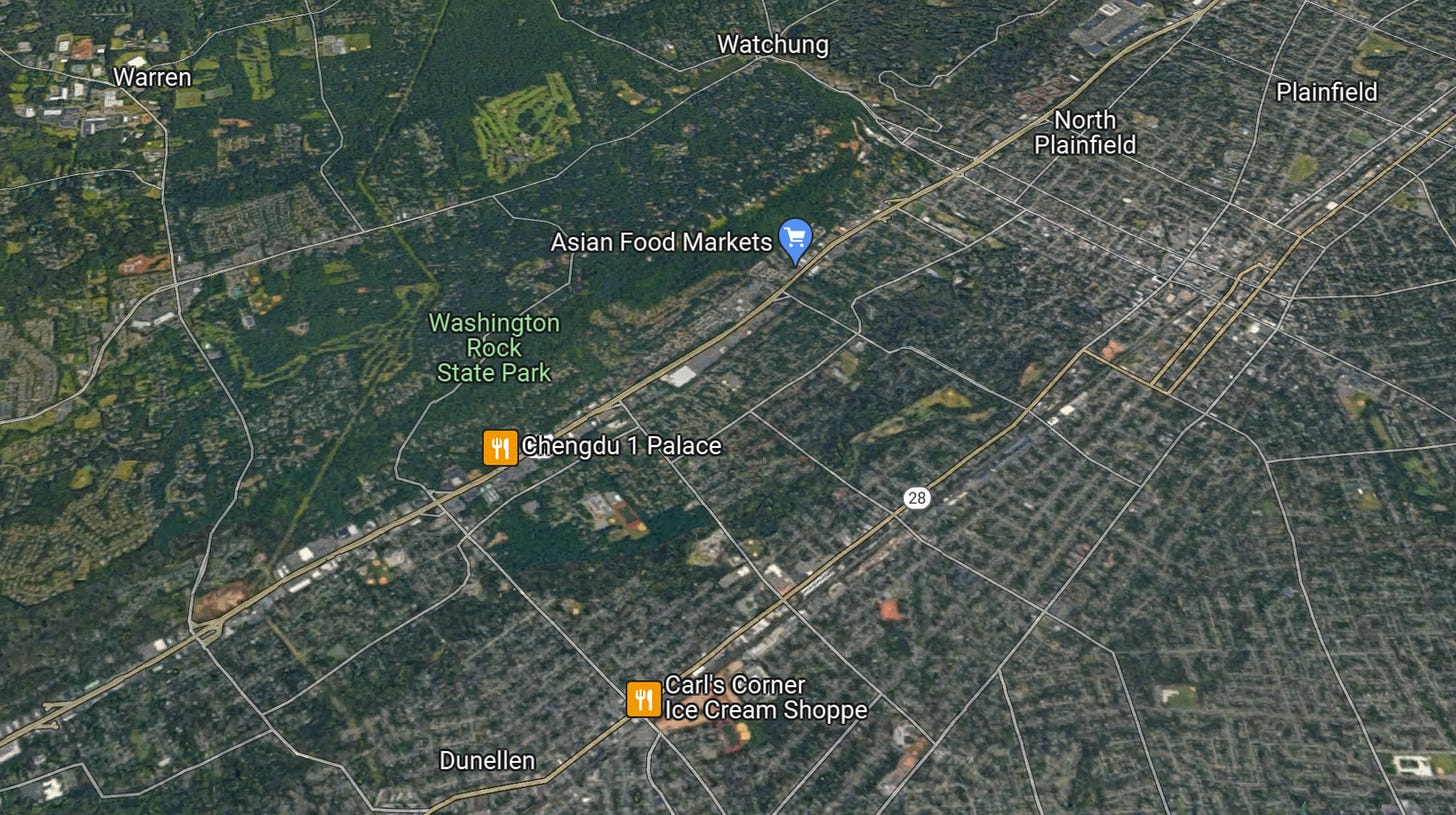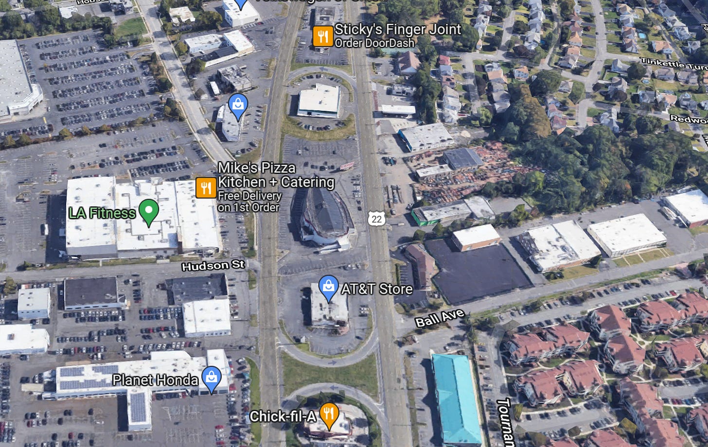 I haven’t even gotten to the stretch where 22’s eastbound and westbound lanes split apart and surround a narrow strip of land with stores on each side. This is where Union, New Jersey’s, famous ship-shaped building resides, and if asphalt were water, it would sail away. Pictures cannot do that stretch of highway justice.