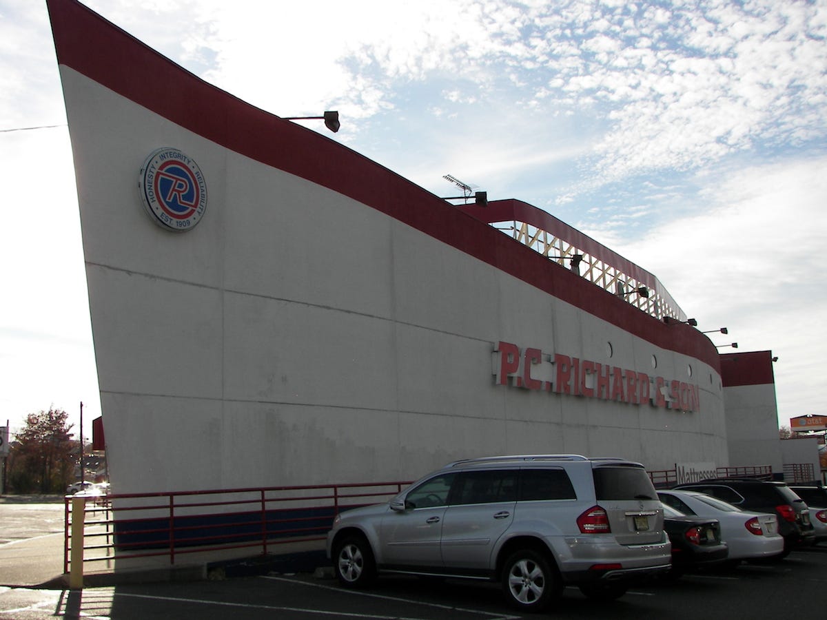 Next, I’d like to show you this. This is the latest of a series of ship-shaped buildings (the first was a nightclub) that has sat on this lot on Route 22 in Union, New Jersey for decades. PC Richard is a regional electronics and appliance store. It’s kitschy, but it sure is cool to drive past.