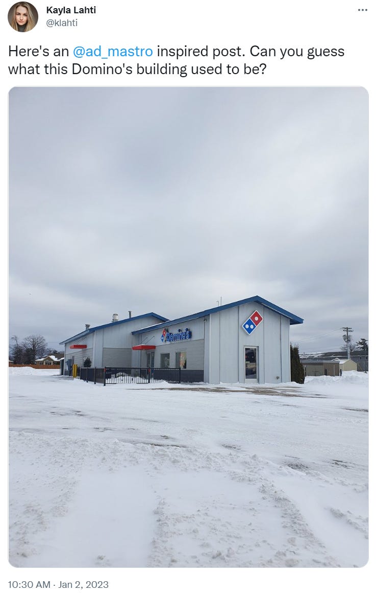 Now, I was not able to guess it. I was imagining some other retail building or restaurant chain, and thinking the distinctive shape of the building was part of the previous chain’s design. Not really, though.