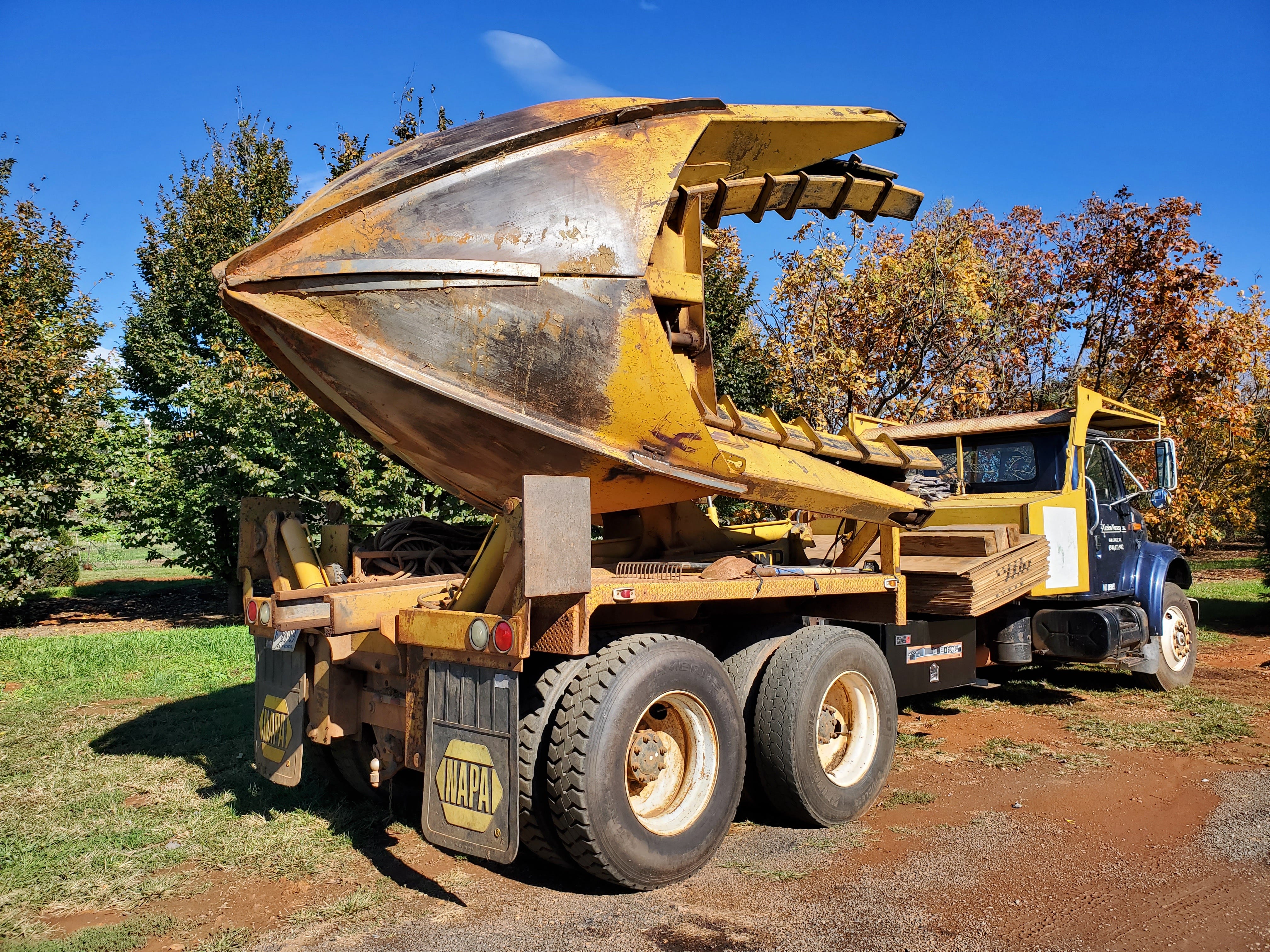 All those field-like areas are trees growing, and the gravel yard and machinery yard are just a tiny piece of the land here. Just savor some more photos taken from the trails, including a walk through the machinery yard where I saw this tree-hole digger that looks just like a GI Joe toy missile launcher!