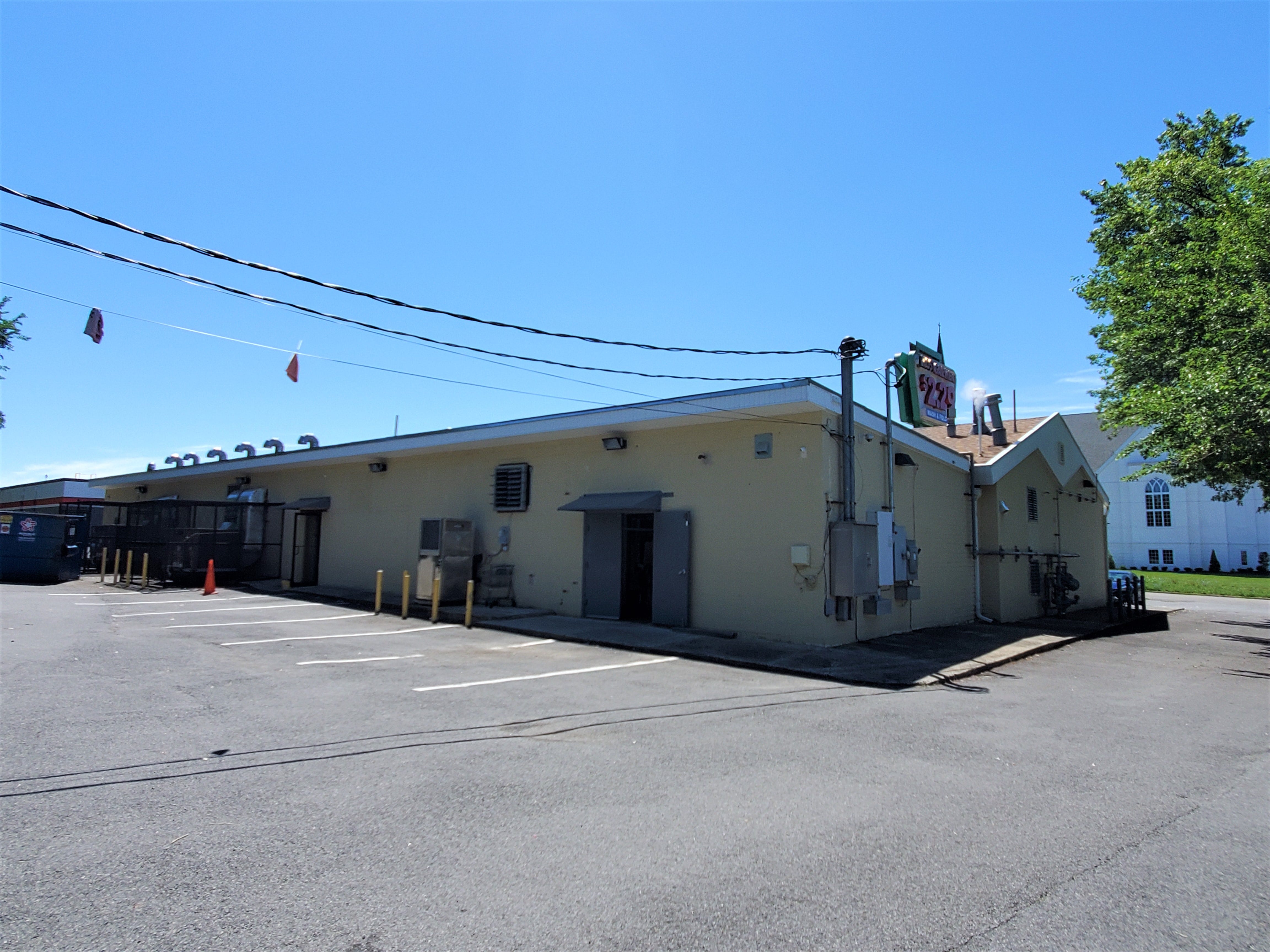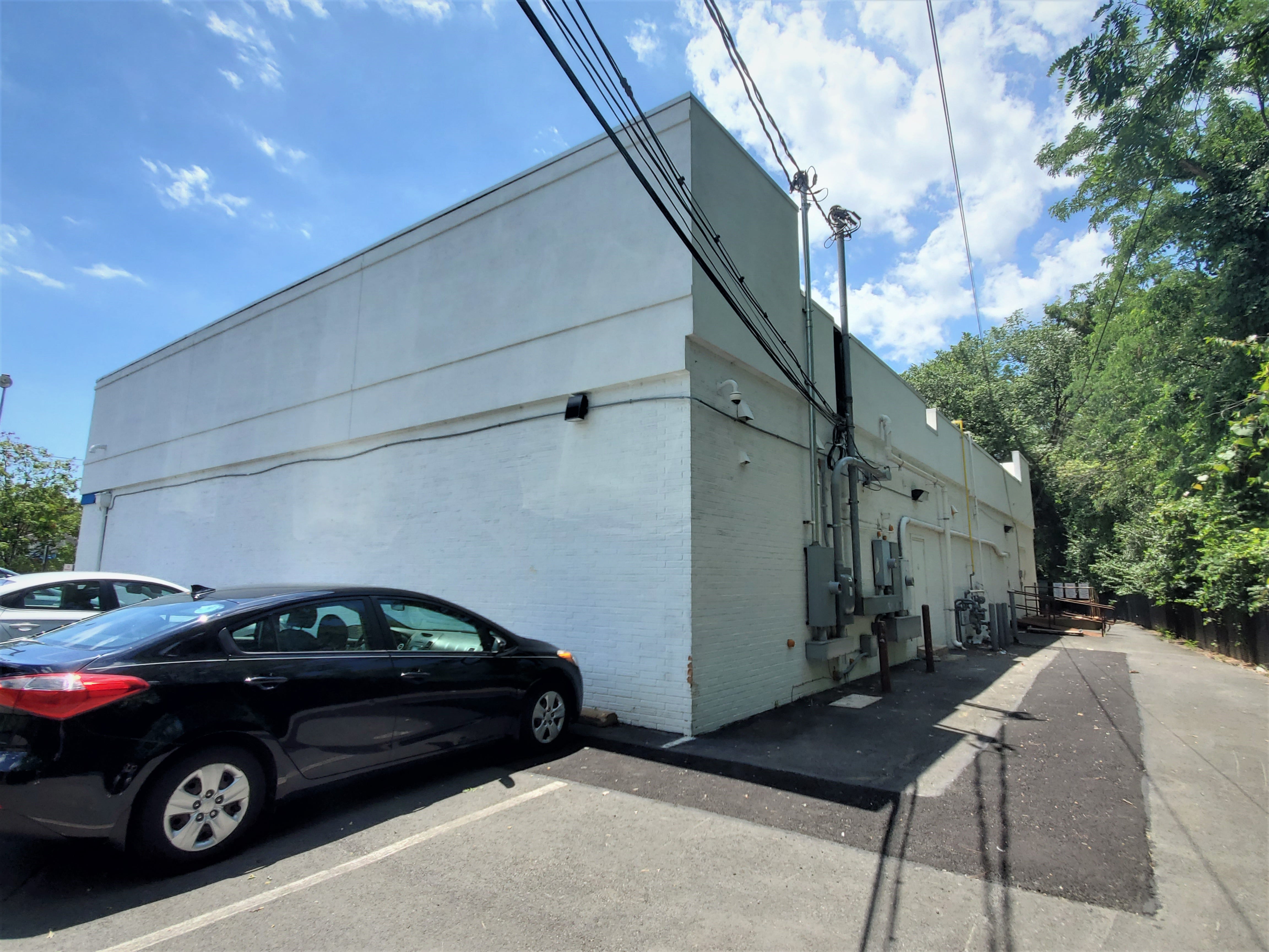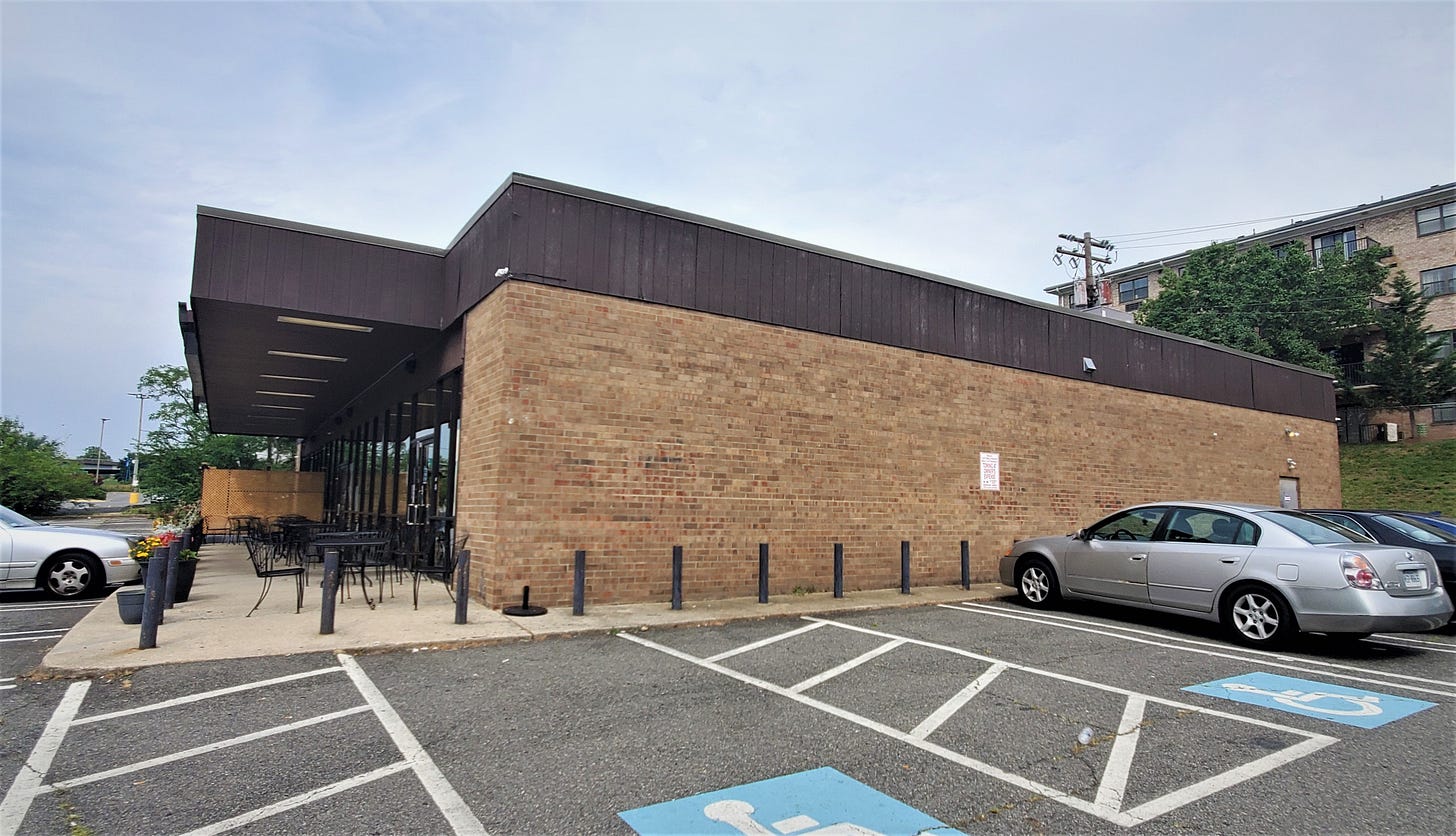 From the back, you can spot similar door placement to the Falls Church location, as well as the wall-like exterior façade which is hiding the original roof.