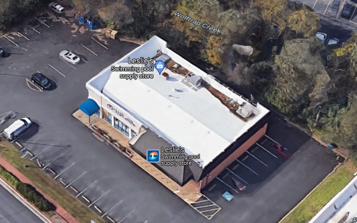 The brickwork around the left and right side of the building’s front appears identical to the Falls Church location up at the top, and the angled roof remains visible from satellite here as well. However, the sign is the same as the Herndon location.