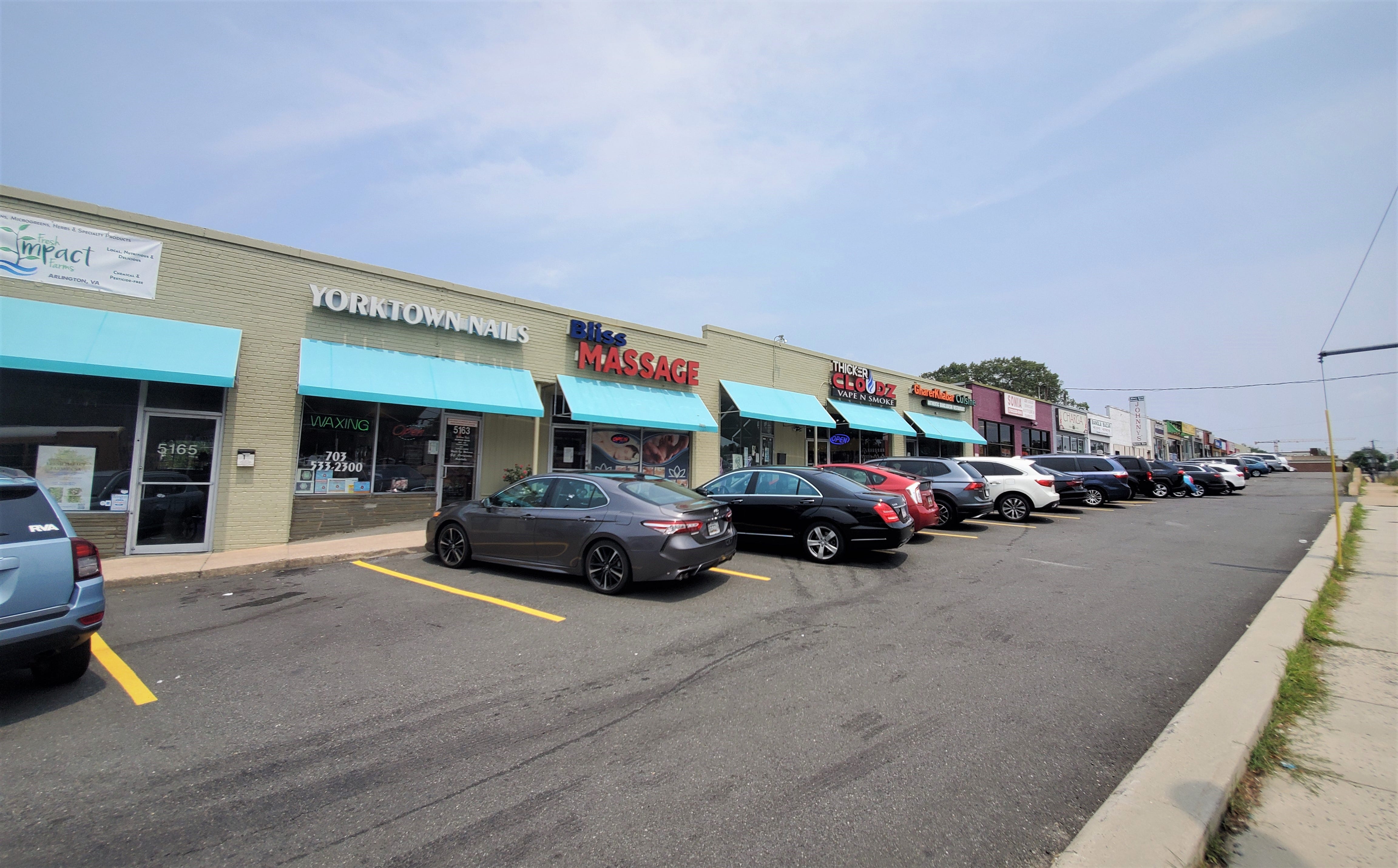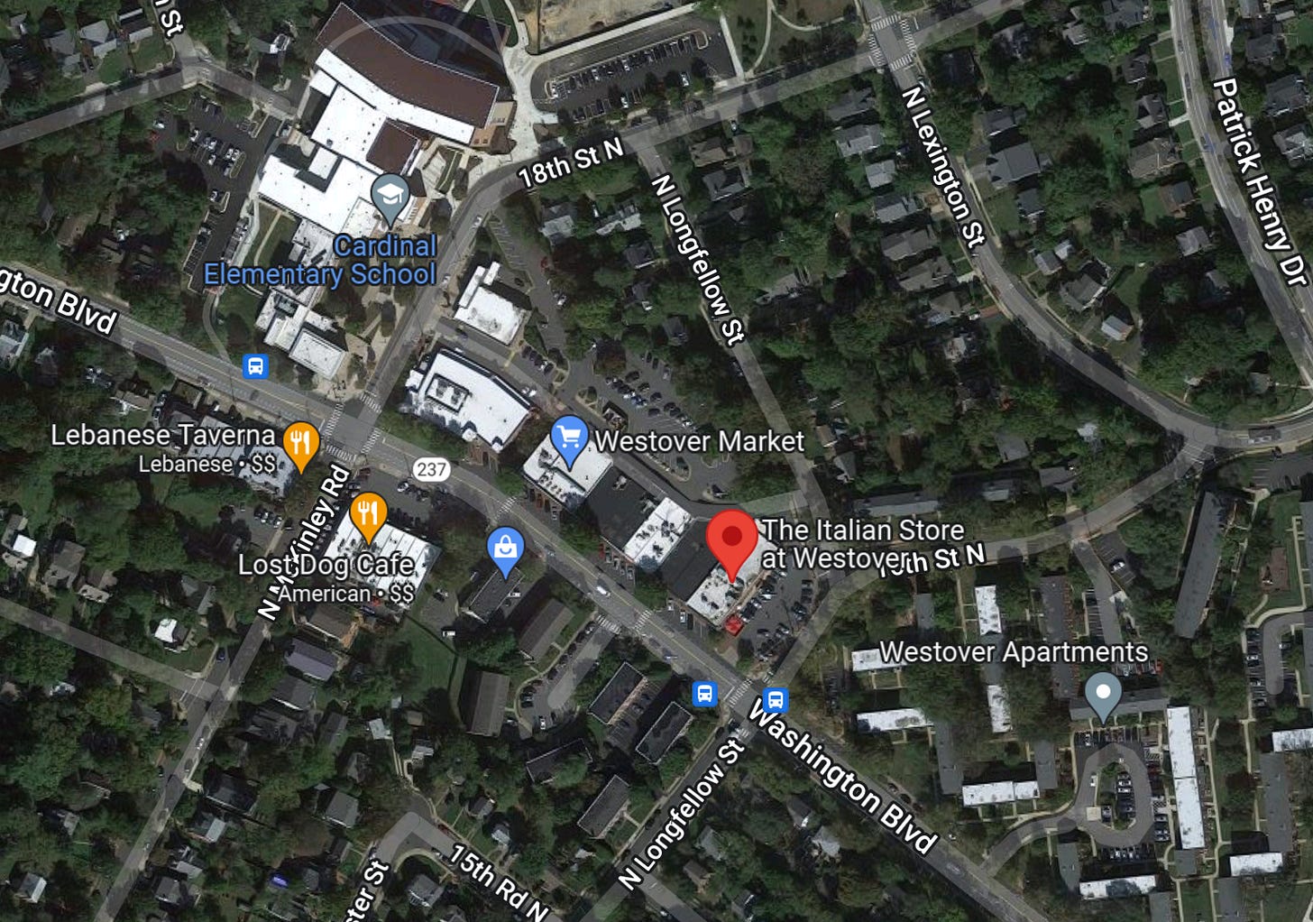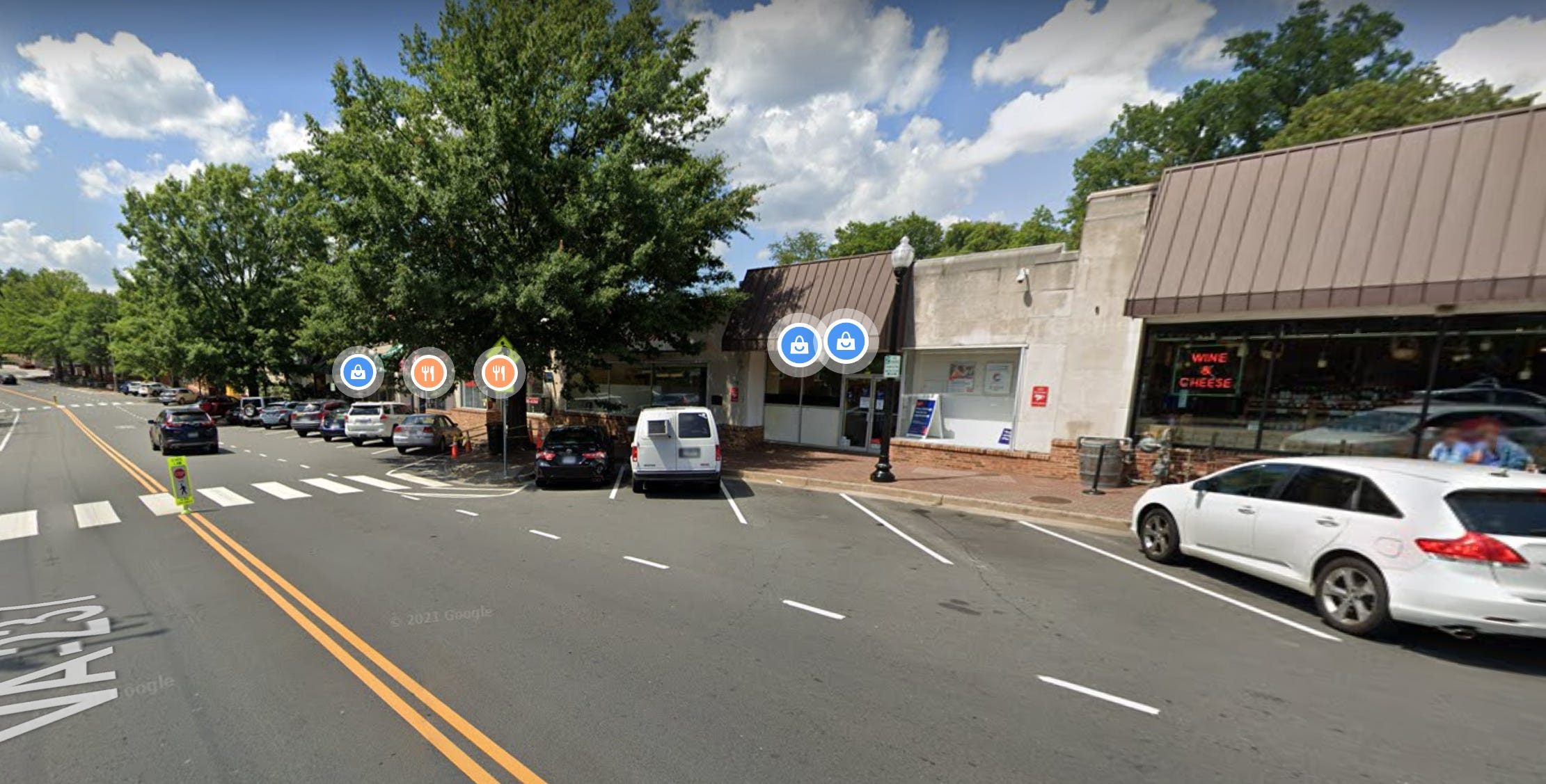 Here it is from the air. You can see that the whole “block” is a single, freestanding building, surrounded by a school and a mix of apartments and detached houses. The commercial strip has angled on-street parking, and a small parking lot off to the side.