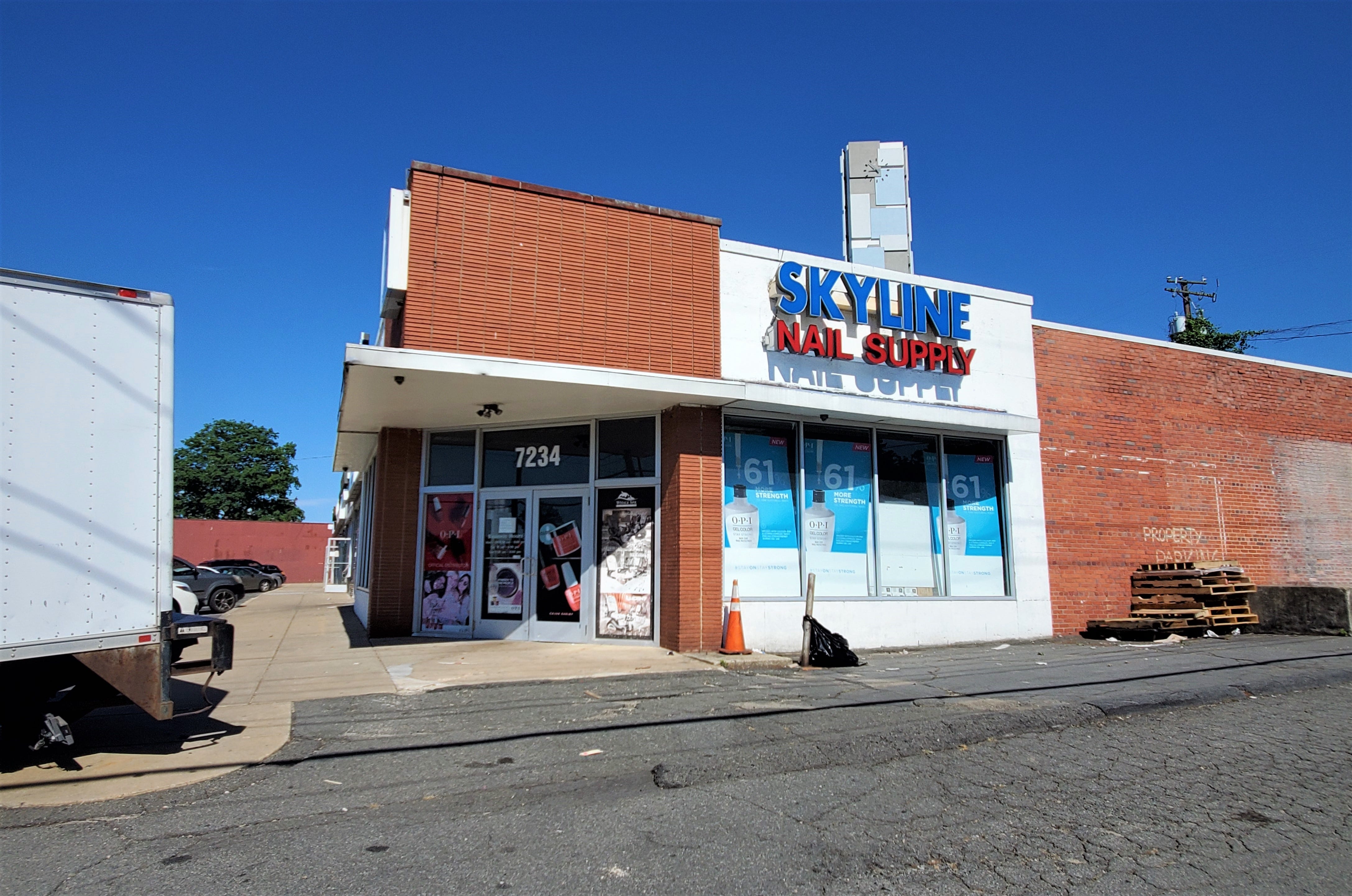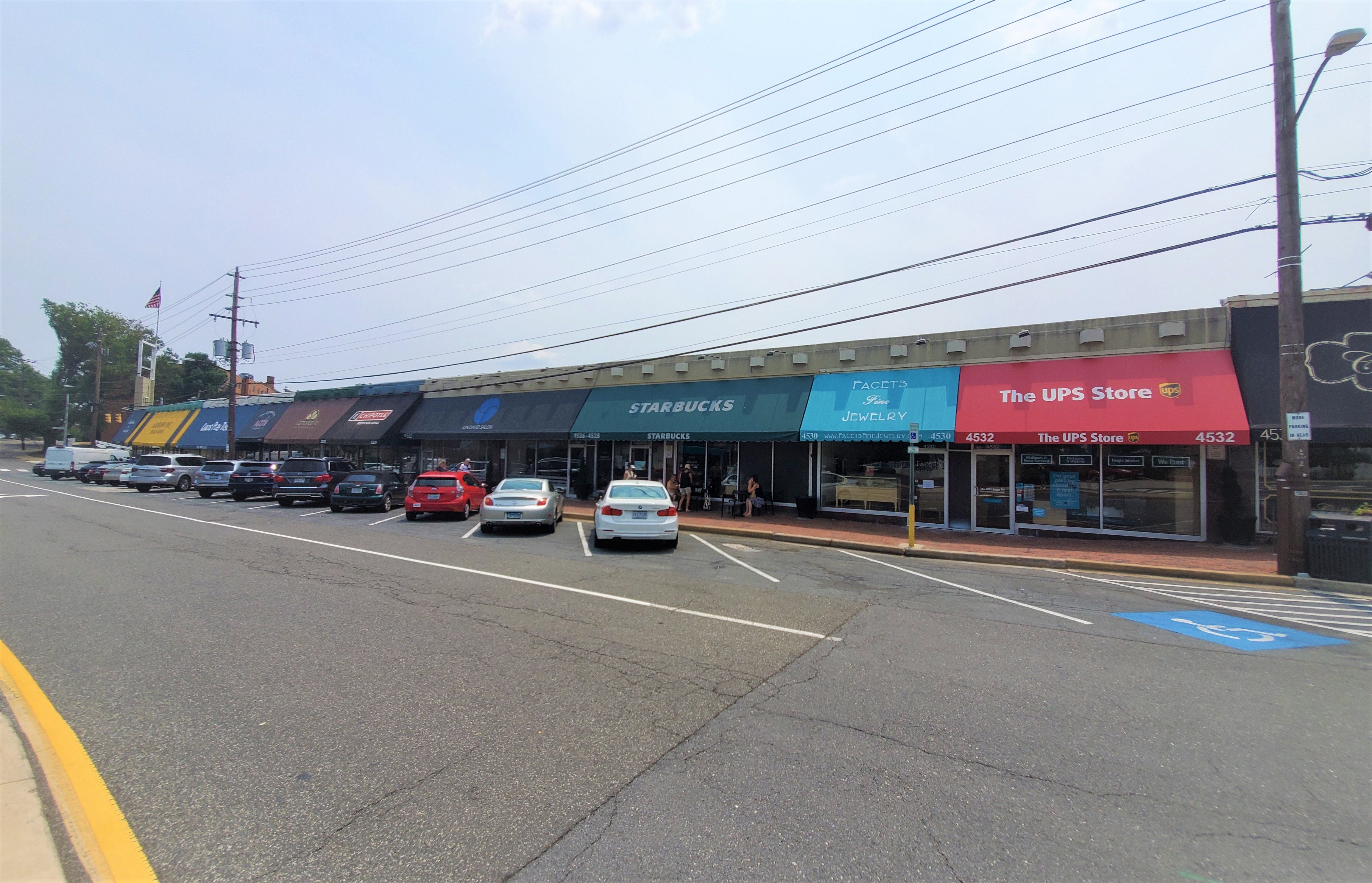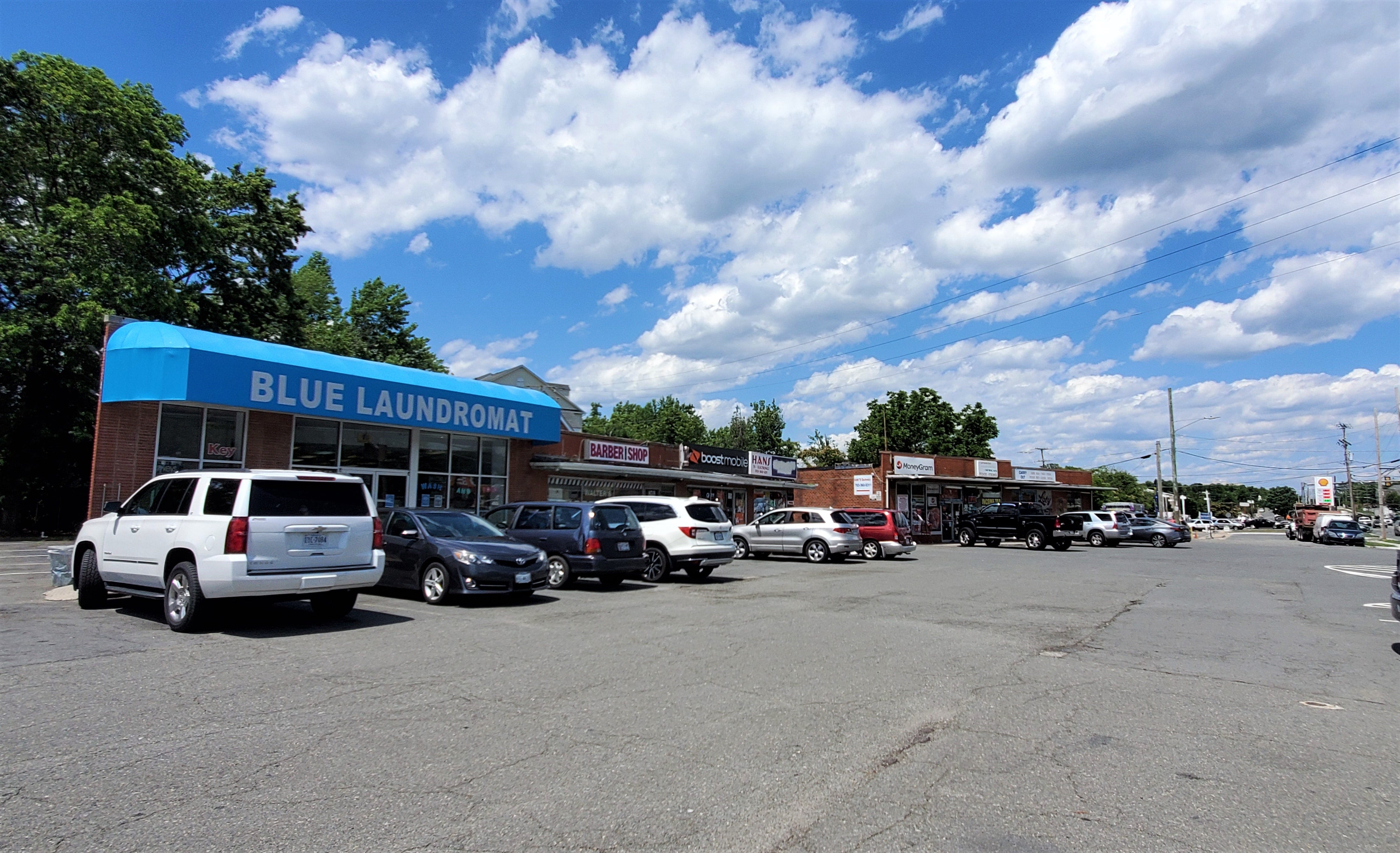 Here it is from the air. You can see that the whole “block” is a single, freestanding building, surrounded by a school and a mix of apartments and detached houses. The commercial strip has angled on-street parking, and a small parking lot off to the side.