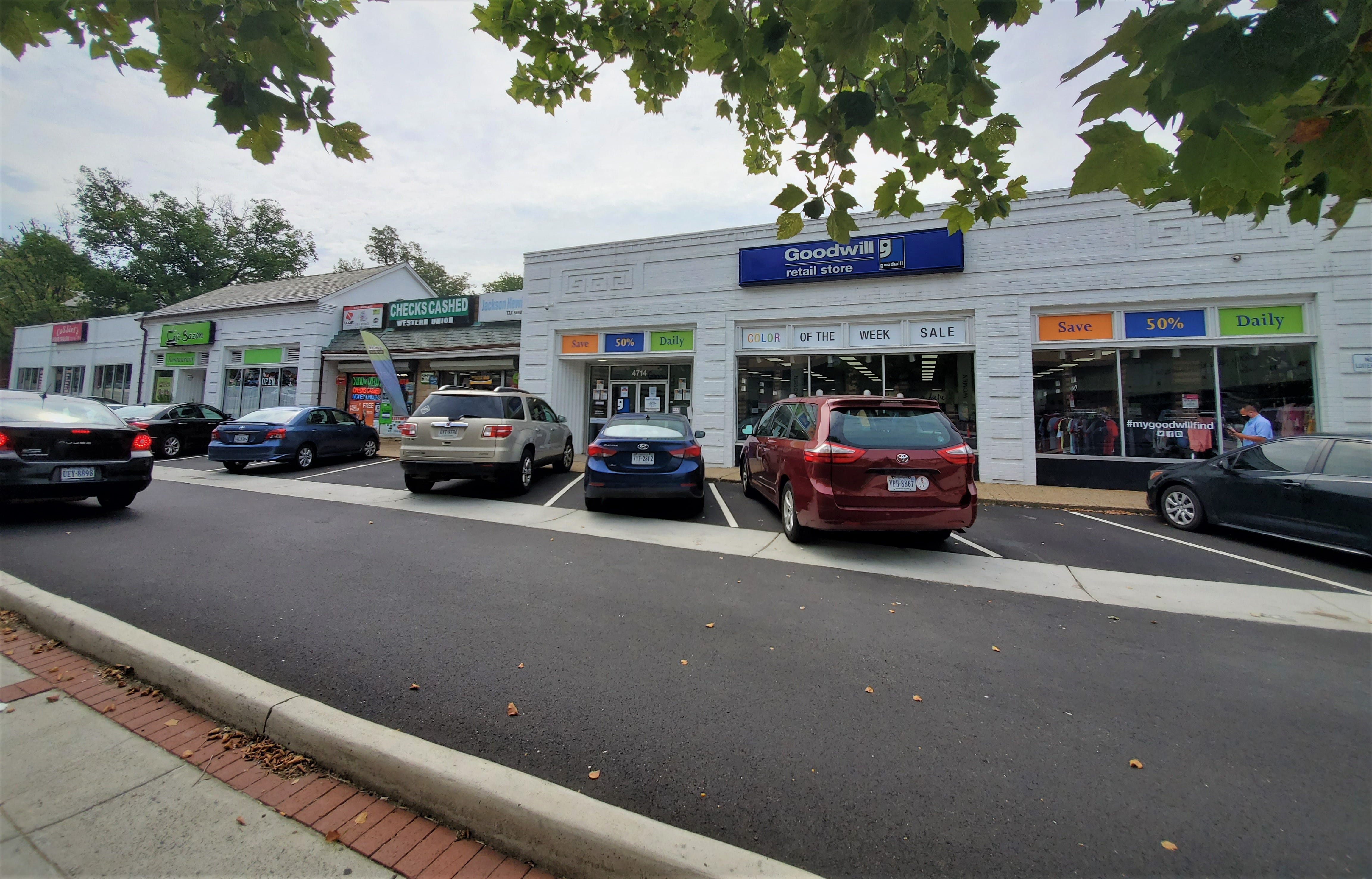 Here’s something similar in suburban Alexandria. Notice the fancy façade work on the Goodwill store, and also the fact that the façade is not continuous. This little shopping center was trying to look like a little segment of Main Street.