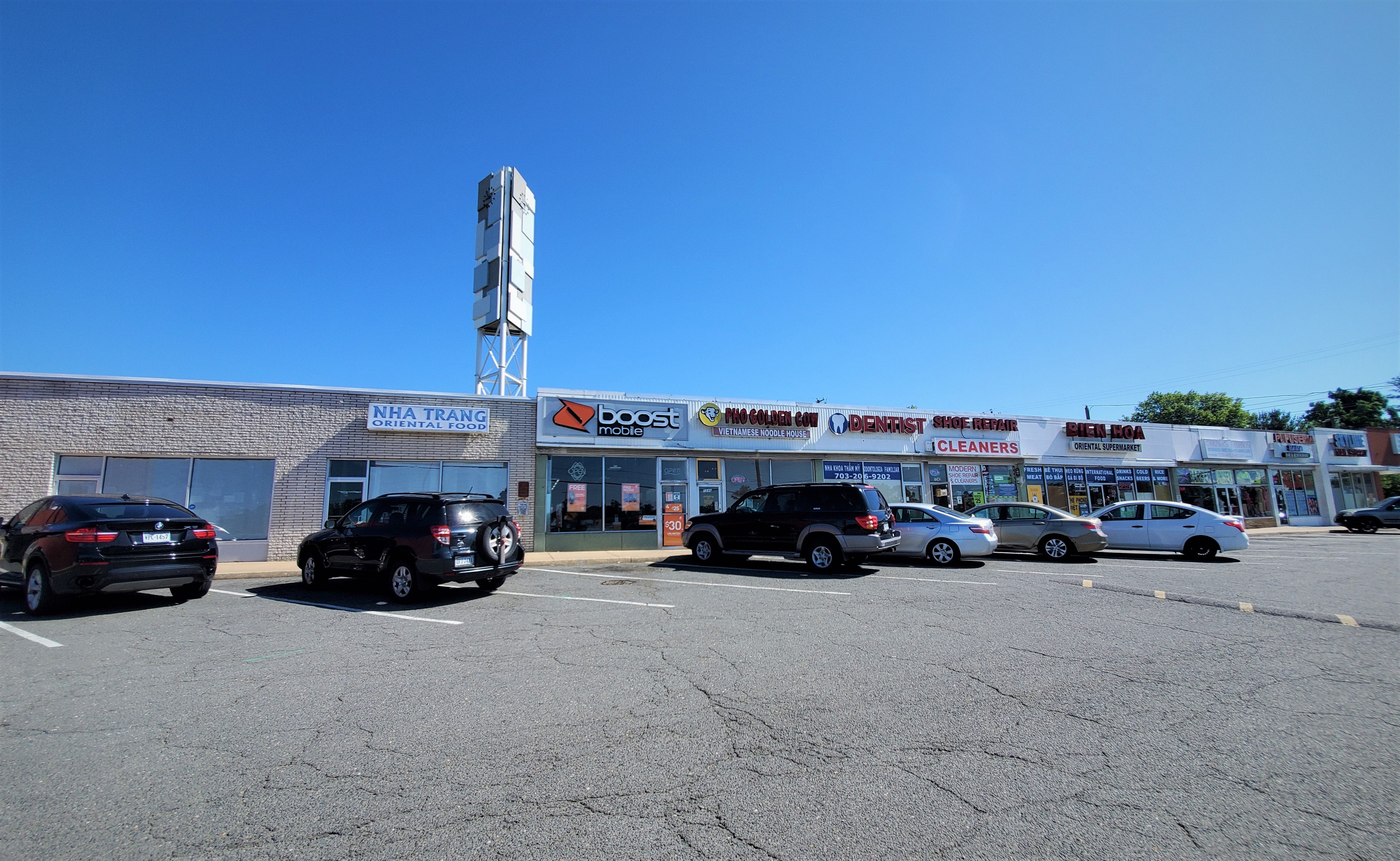 Not too far away on U.S. 50, in Falls Church (Fairfax County, Virginia now), there are some very similar structures, but with larger parking lots. In the picture below, there’s a lot of parking lot behind me, but there are still the angled on-street style parking spaces up against the building.