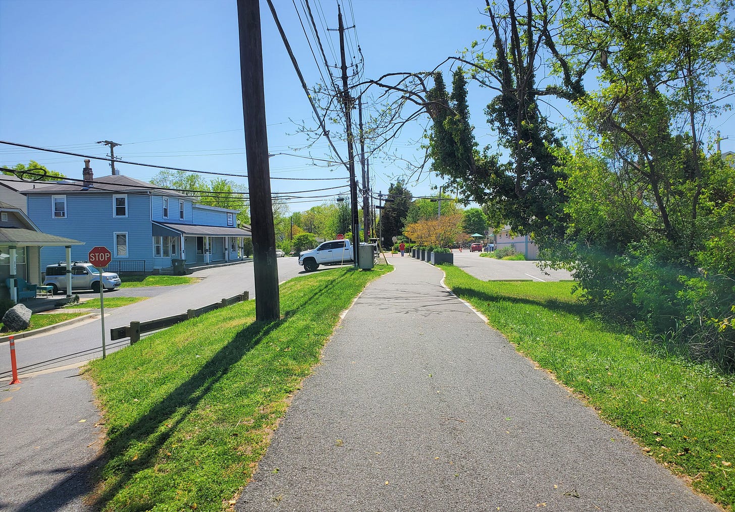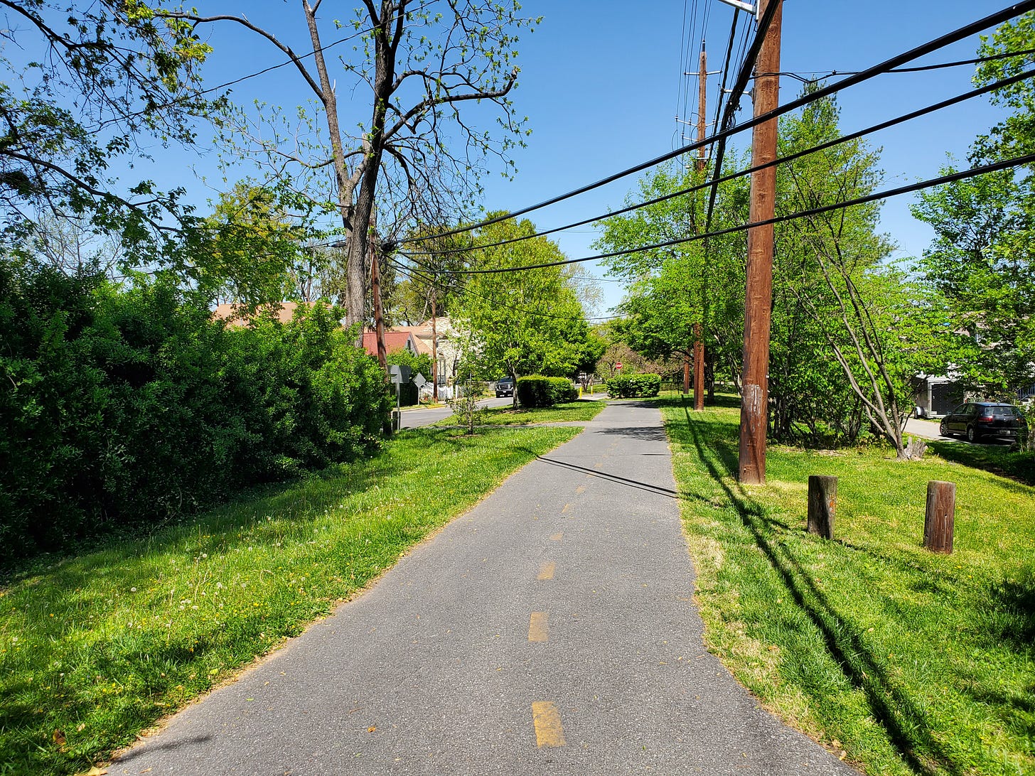 Maybe it’s all of those things. It’s an old streetcar neighborhood within the city of College Park, Maryland, resembling a city in miniature: a church in a sort of town square, detached houses, attached houses, and a tiny commercial block. The walking/biking path in the photo above is the old streetcar right of way.