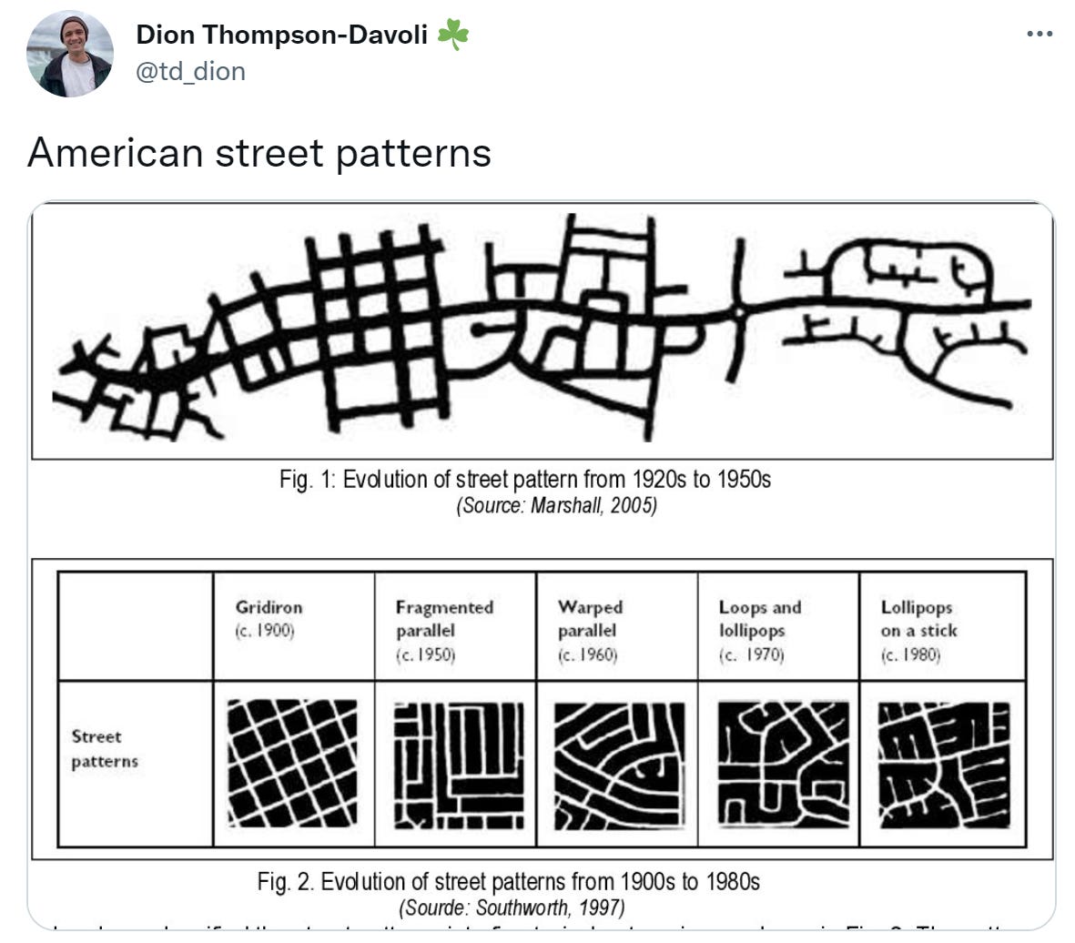 You can see, with those street patterns, how the basic connectivity of the streets is lost in stages, over time, until you don’t have connectivity at all. This is how you get the absurdity of two houses whose lots border each other being five minutes away by car (I’ve seen this kind of thing before.)