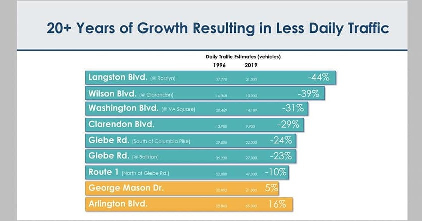 There’s a really interesting graph from a traffic study in Arlington, which, yes, has a lot of traffic. But what it shows is fascinating: despite growing tremendously in the last two decades, Arlington has not seen more traffic along with those new people. Most major thoroughfares have seen a considerable decrease in traffic!