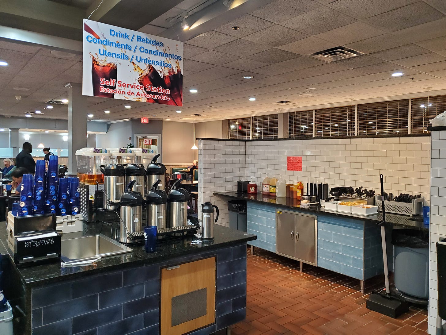 A few other aspects of the place depart from the predominant buffet template today. This one has a self-serve drink fountain/silverware cabinet/sauce station (ketchup, soy sauce, etc.) It saves the servers time, and maybe means fewer overall are needed. It means that nobody has to ask about free refills, or keep count. Since the whole ethos of a buffet is you do you, it doesn’t feel like any service is missing. Since it’s built in permanently, it manages to reduce service without feeling tacky.