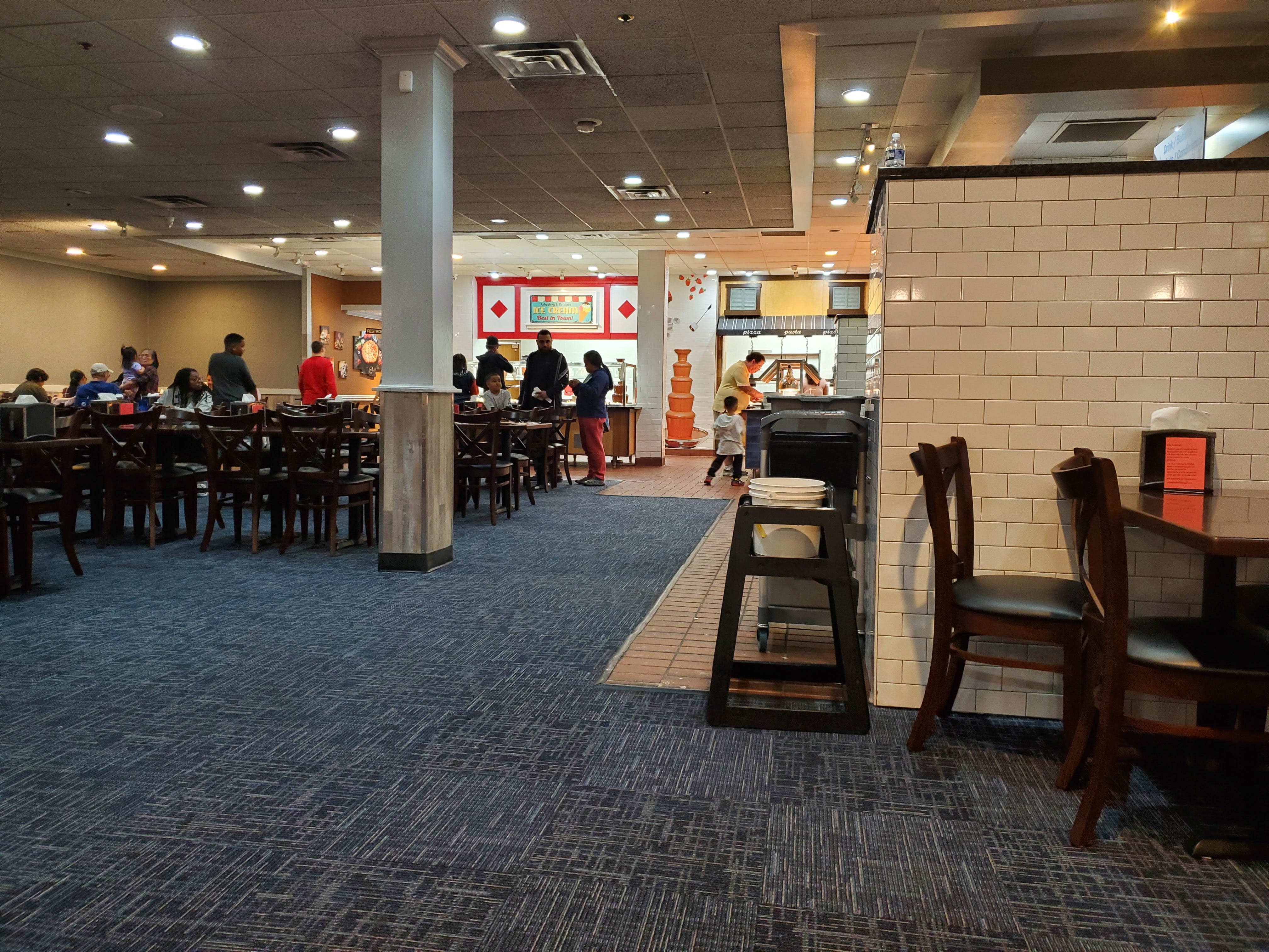 Second of all, the interior has been considerably remodeled. New furniture, new carpets, the steam tables themselves either revamped or completely replaced. Here’s a (poor) image from the Old Country Buffet’s old Yelp page: