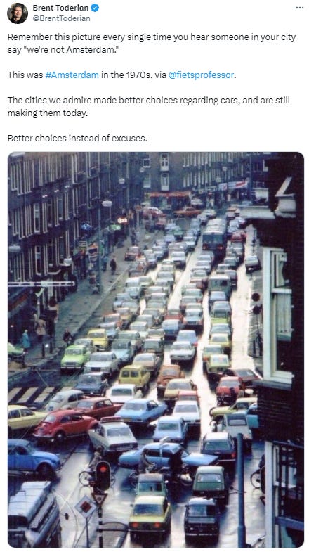 It should be noted from the picture that while they had a super wide road, the setting is a proper city. It's much easier to roll back car dependency if your environment allows for it. In other words, Amsterdam in the 70s look much more like New Amsterdam than Breezewood, PA.