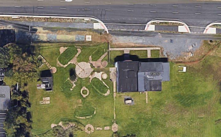 There’s a building on this site in 1949, according to Historic Aerials (there’s no imagery before 1949), but no building there in 1937 (the oldest year in Fairfax County’s aerial photo database). and while it’s not shaped quite the same, I believe at least some of what’s here today is the same structure. One of the halves here is original; I believe the right one, but am not positive (the old imagery is too grainy). If you look closely, you can see the right half is symmetrical—the door in the middle of the protruding front area, the symmetrical horizontal windows, and the symmetrical rounded area with rounded windows on each side. I think this is the original bit because you can see the rounded window on the left is partially engulfed by the left half of the building. That right half appears to be built in a vaguely Western theme. In this era, a lot of buildings were built in deliberate styles; classic colonial-era house was one of the most popular, but so were styles like “Indian,” Western, mimetic (“duck architecture”) and later Space Age.
