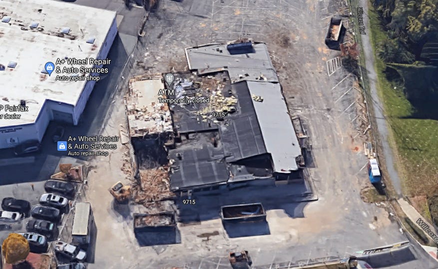 Those three windows on either side of the Carvel entrance were diner windows! The two-story area behind the diner appears to be original, as it’s there in 1960 aerial imagery from Fairfax County. It’s probably some kitchen or prep space and an office or even a living quarter.