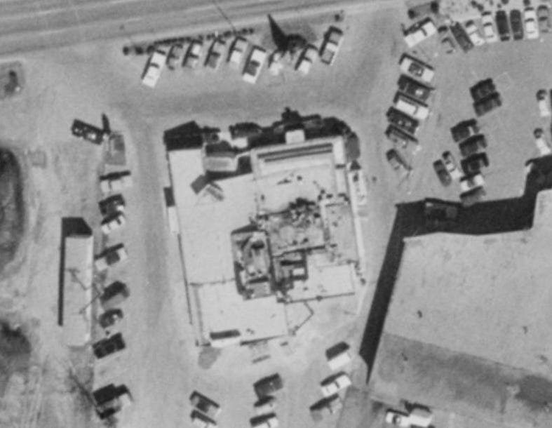 Here are aerial photos from 1960 and 1972, showing the original building and the Bob’s addition.